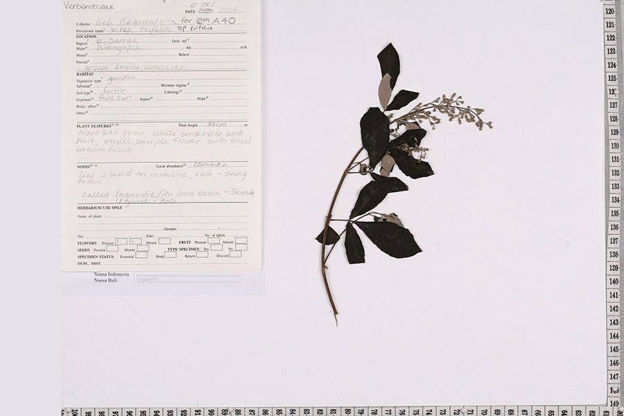 Leaves are used to cover lime so it remains active. Tony Cunningham notes: To keep things balanced. Leaves placed under dye pot to keep misfortune away, as is salt, and rubbed garlic which is placed in a lontar pouch strung around the neck of the dye pot.