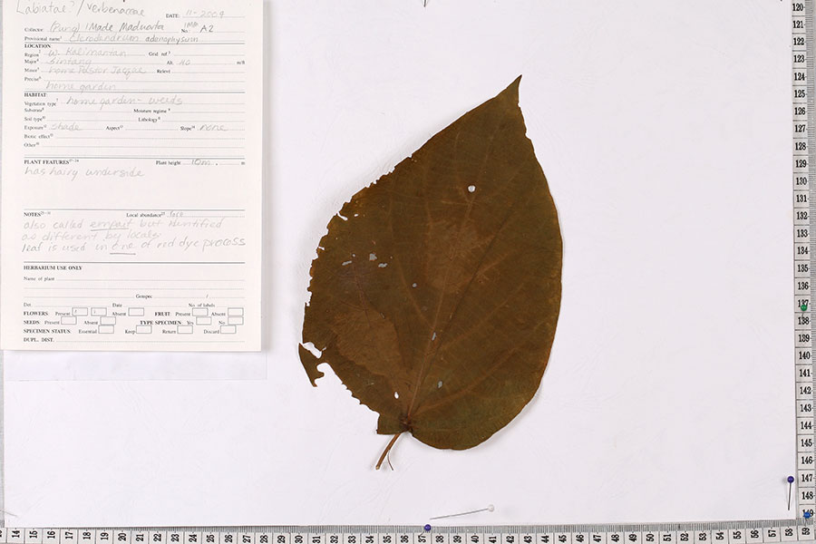 Leaves are combined with lengkar (Clerodendron sp.) bark and lime to produce red dye within the hot process.