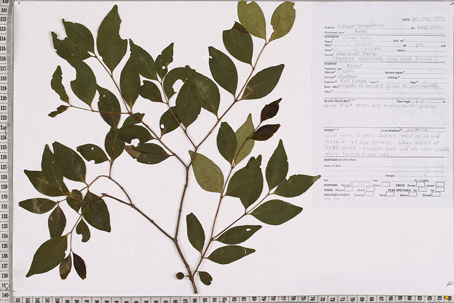 Leaves used dried and fresh in red dye process. When tested at YPBB studio, threads turn red as when using alum source + morinda