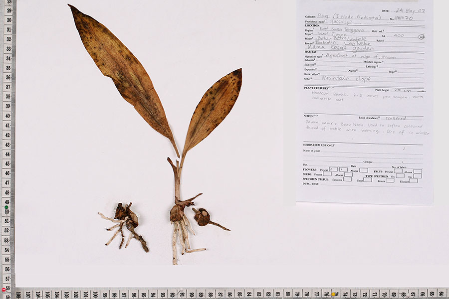 The tuber is taken and pounded and made cooked in water and the water is used to stiffen the threads (kanji) before weaving. They use Tiro (Taccaceae) to make a white thread brighter which is used as accent in the weaving process